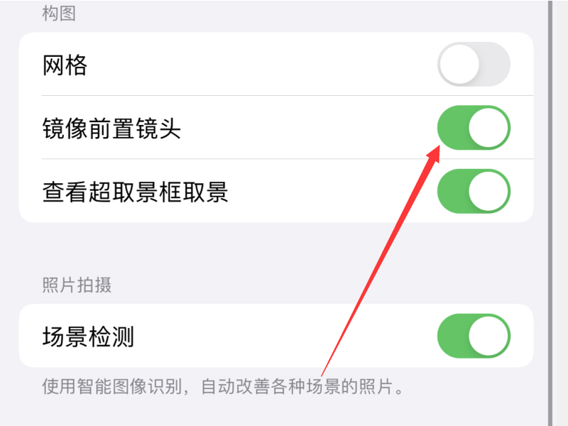 2、进入页面后即可看到“镜像前置镜头”的按钮,关闭按钮即可。
