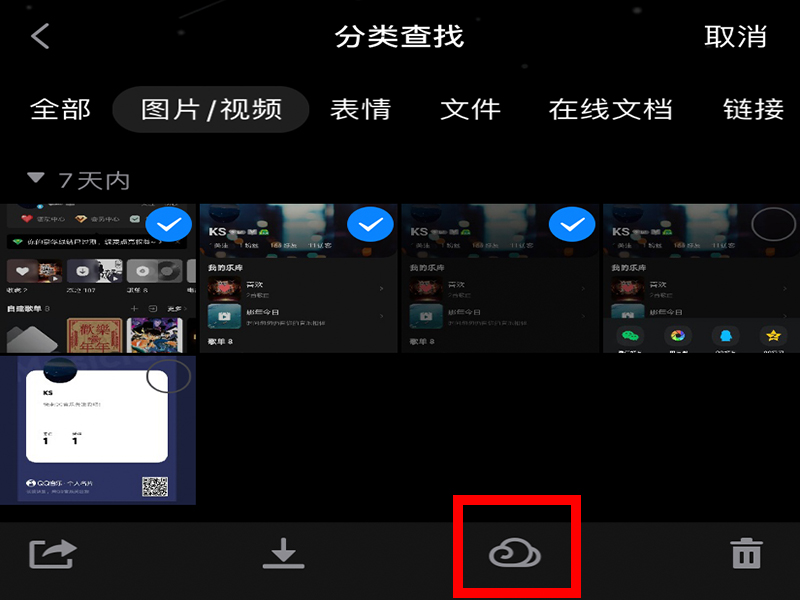4、进入“分类查找”界面后,选中要备份的图片,将其存到微云即可。
