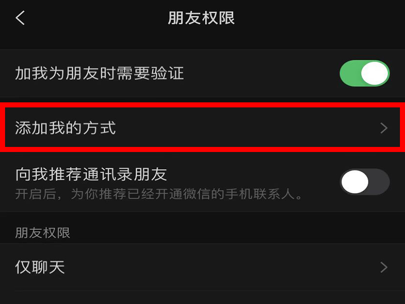3、进入“朋友权限”界面后,点击“添加我的方式”。