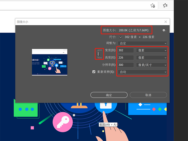 2、点击宽度和高度左边的关联,锁定图片比例,然后调整宽度、高度、分辨率的参数,调整图片至合适的大小。