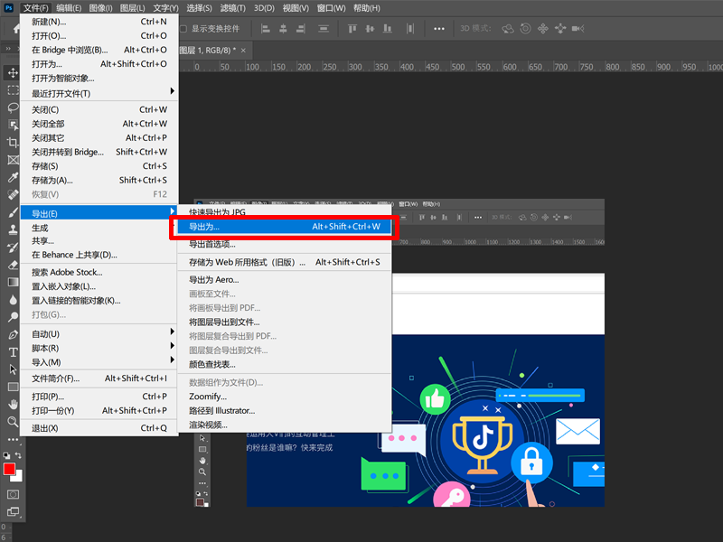 3、在PS上方工具栏选择“文件”,选择“导出”后选择“导出为”,选择导出图片格式后导出即可。