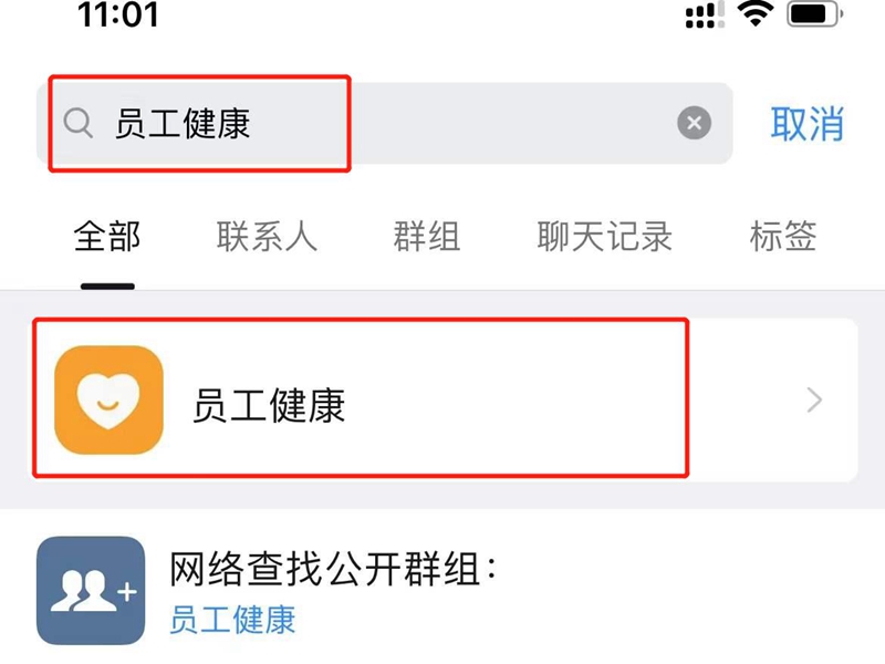 1、打开钉钉app,在“消息”页面的搜索栏里输入“员工健康”,进入员工健康页面。