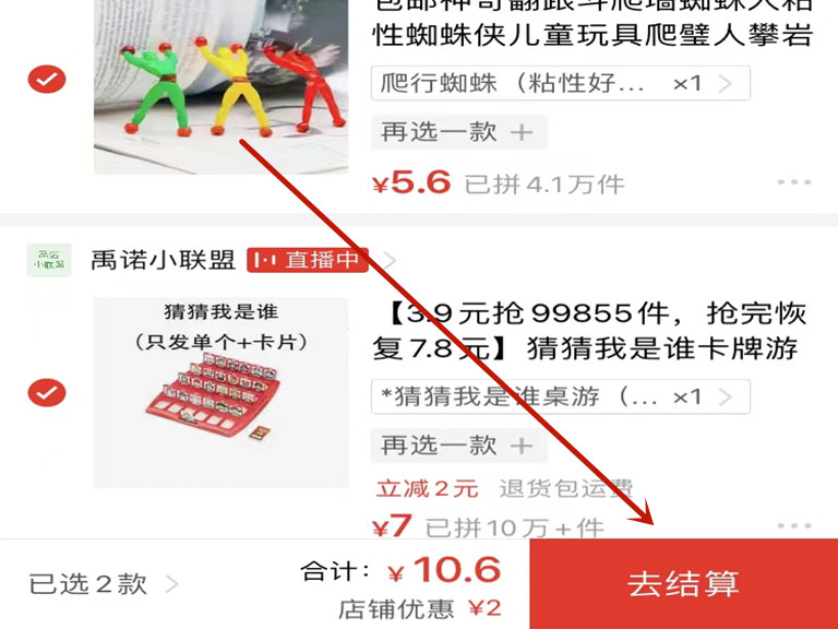 4、选择“商品”,点击“去结算”即可一次买多件不同商品。