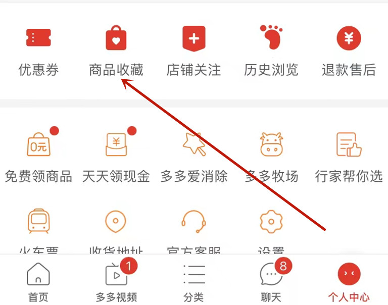3、返回拼多多首页,切换到个人中心,点击“商品收藏”进入商品收藏页面。