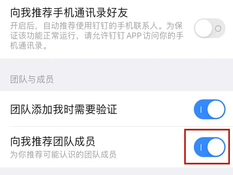 3、关闭“向我推荐团队成员”即可关闭钉钉团队邀请。