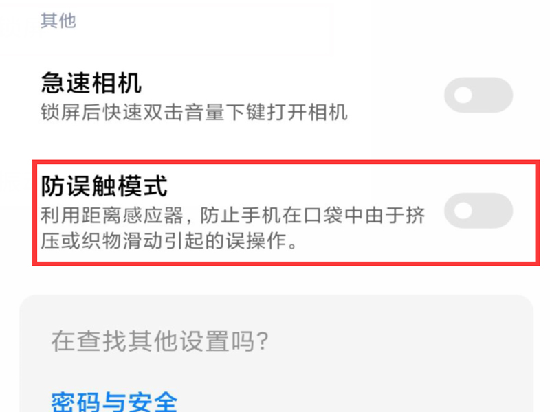 2、把页面中的“防误触模式”按钮进行关闭即可,关闭后感应器遮住也不会黑屏了。