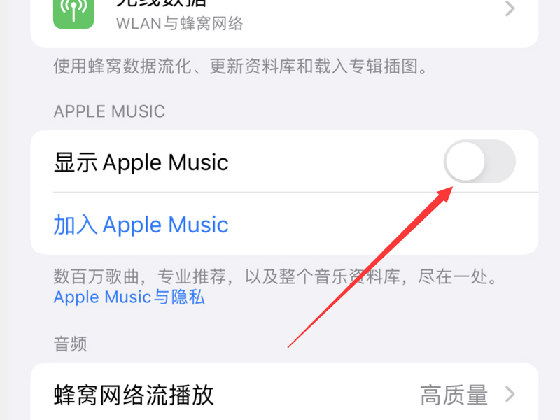 2、在页面中把“显示Apple Music”按钮的开关进行关闭即可,关闭后锁屏界面就不会再显示未在播放了。
