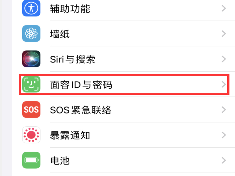1、打开手机的设置,点击“面容ID与密码”的按钮,进入面容ID与密码的设置页面中。