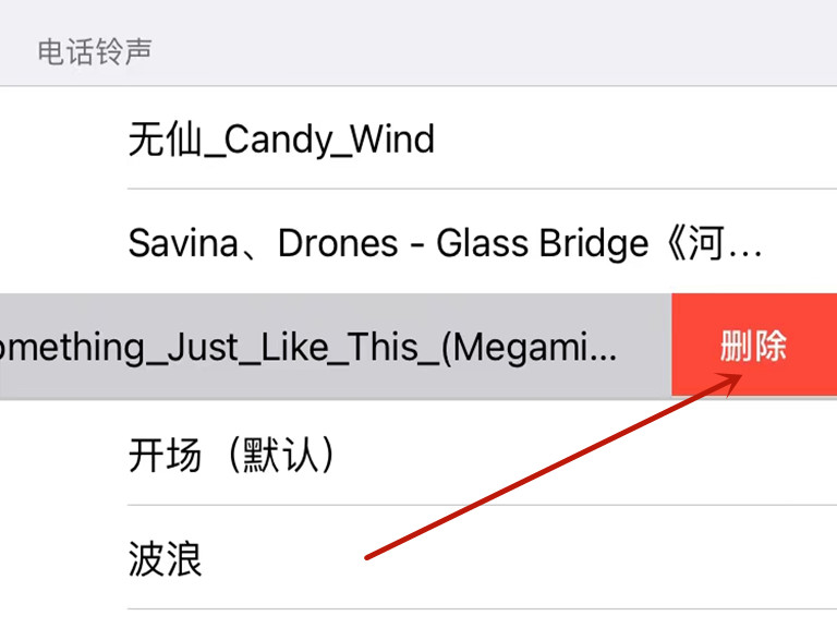 3、向左滑动想要删除的铃声,点击“删除”即可删除苹果导入的铃声。