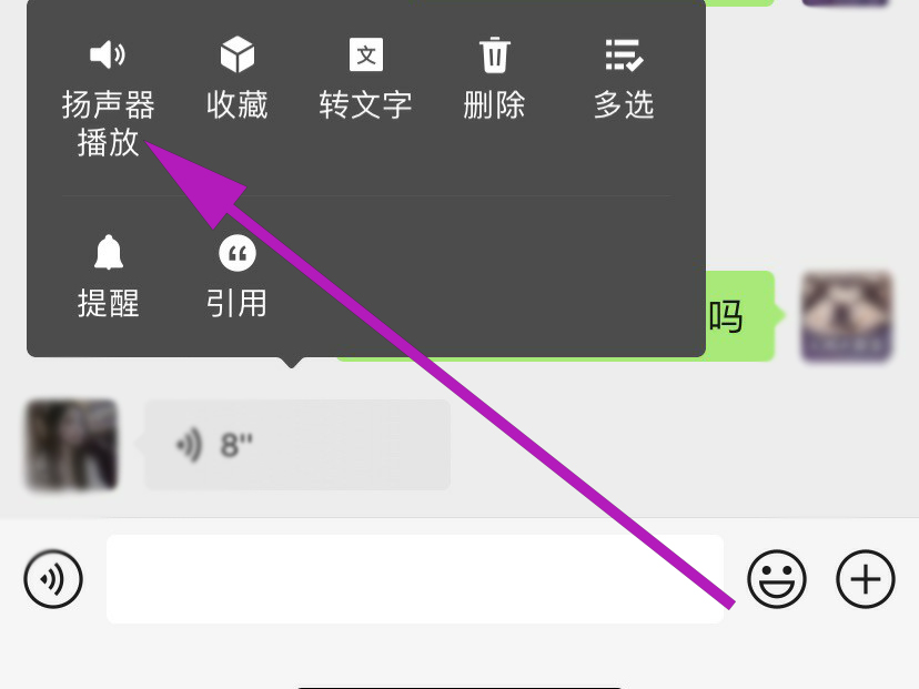 1、打开微信,选择你要听的微信语音,然后长按,在选单中选择“扬声器播放”选项,即可使用扬声器来听语音。