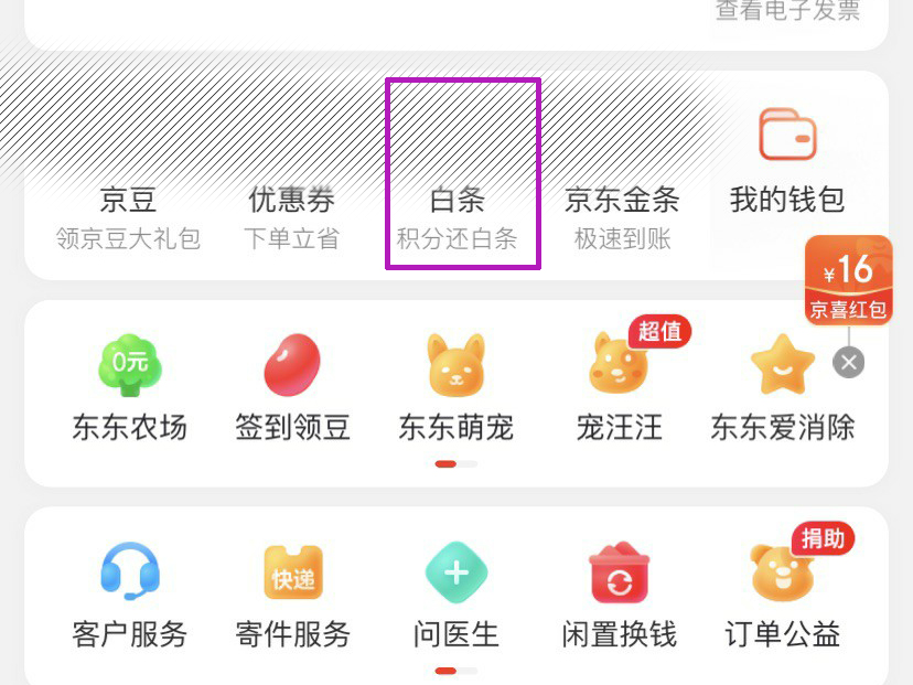 1、打开京东,点击右下角“我的”图标,然后找到并点击“白条”选项。