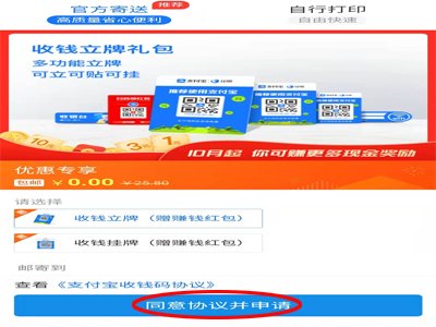 4、支付宝收款码有“商家寄送”、“自行打印”两种方式,选择后点击“同意协议并申请”,即可成功领取收钱码。