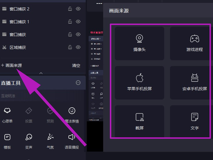 1、打开快手直播伴侣,然后找到并点击画面来源选项,就可以自由的设置自己直播时的画面来源。