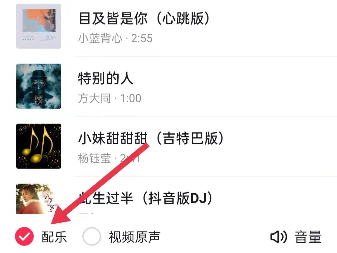4、在选择音乐页面中取消勾选“视频原声”,选择配乐。