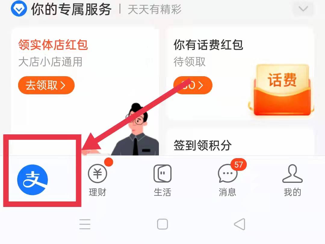 1、打开支付宝aqq,点击的左下角的“支付宝”,进入支付宝首页页面。