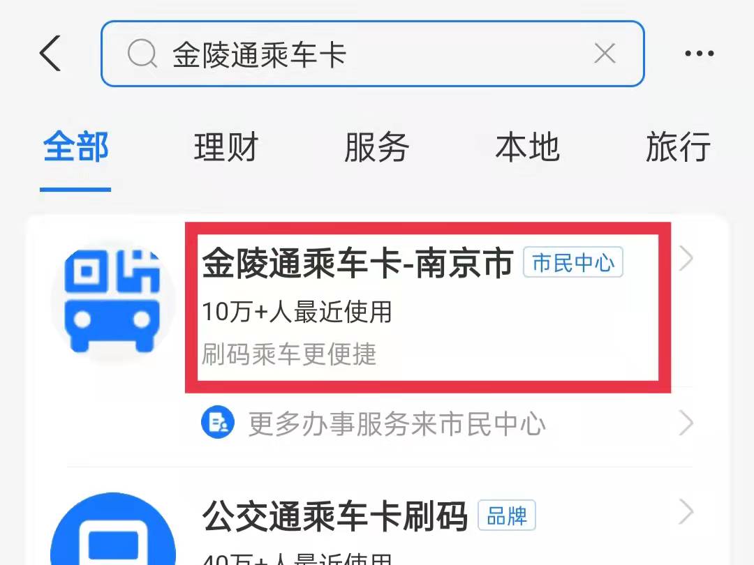 2、在支付宝首页页面的上方的搜索框输入“金陵通乘车卡”,点击进入。