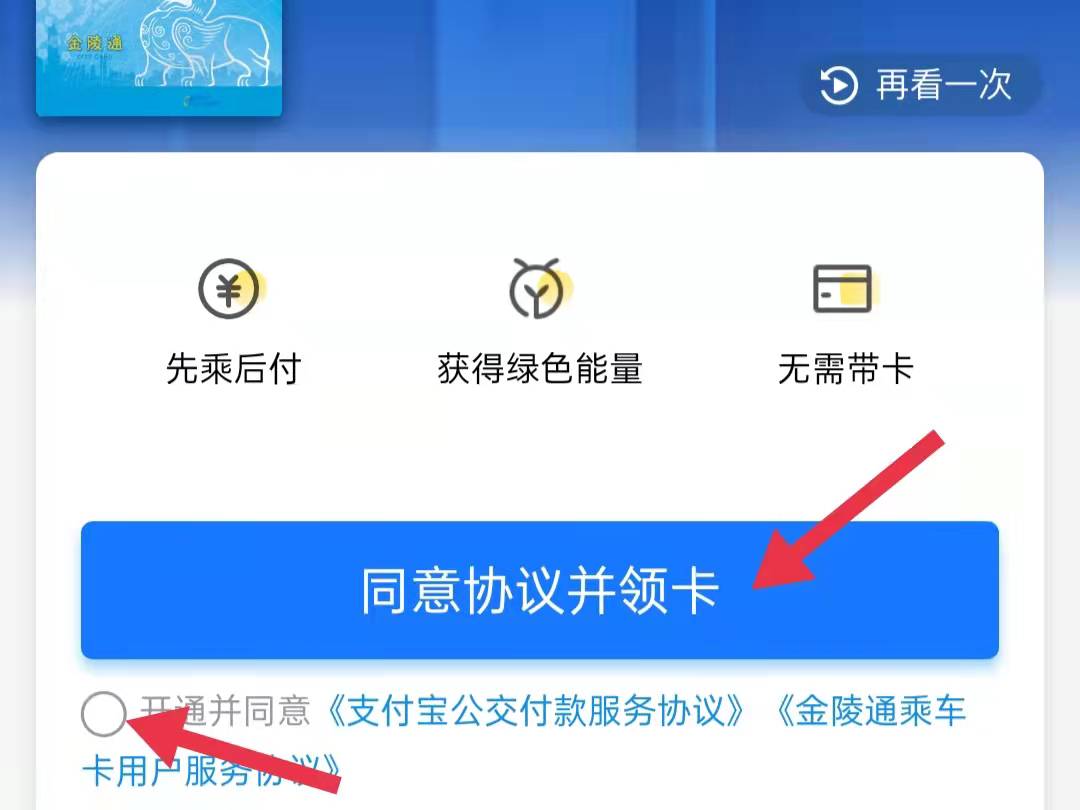 3、在金陵通乘车卡页面点击“同意协议并领卡”,勾选协议进入服务授权页面。