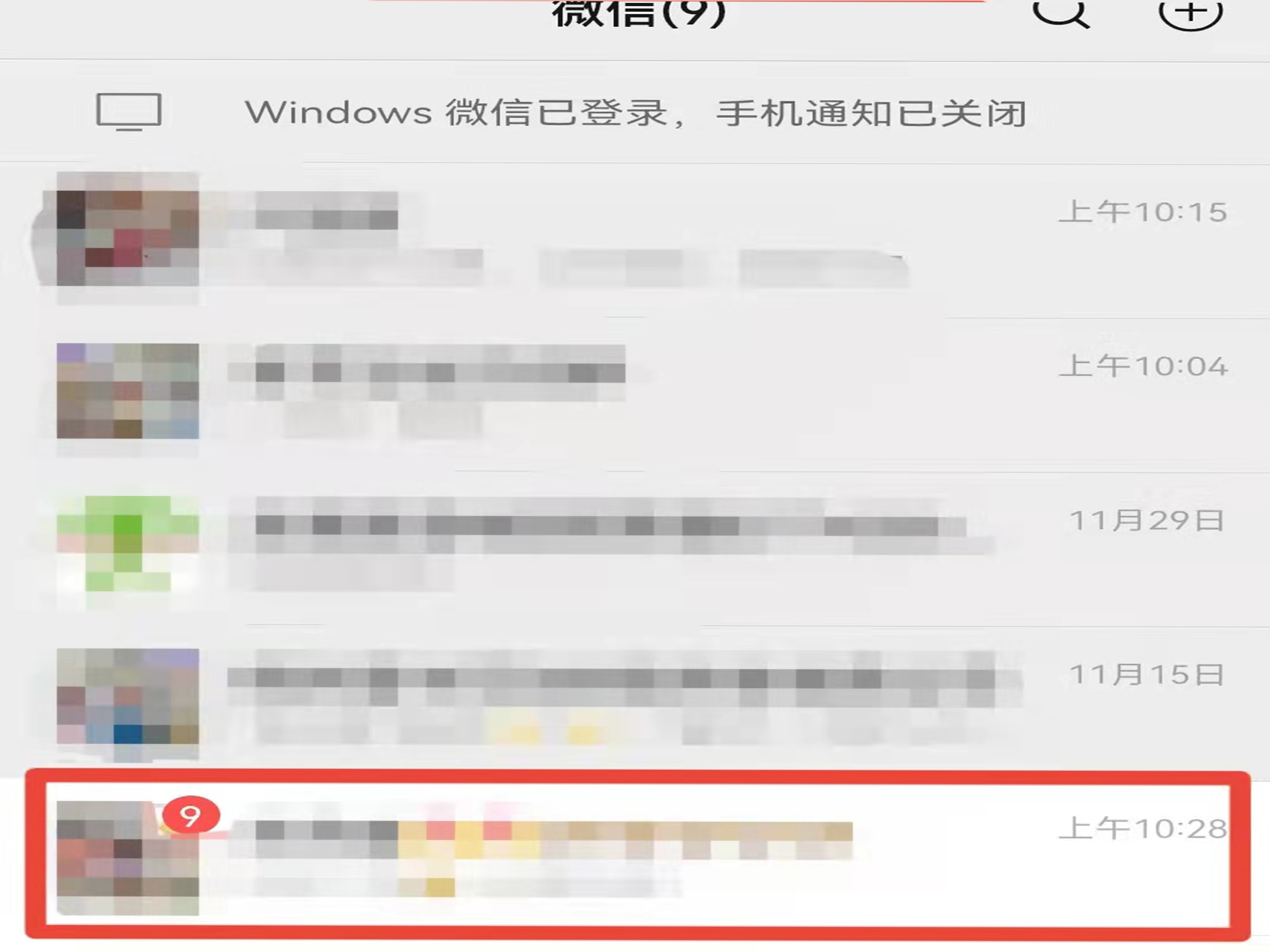 2、选择聊天框,并长按接收到新信息的聊天框。