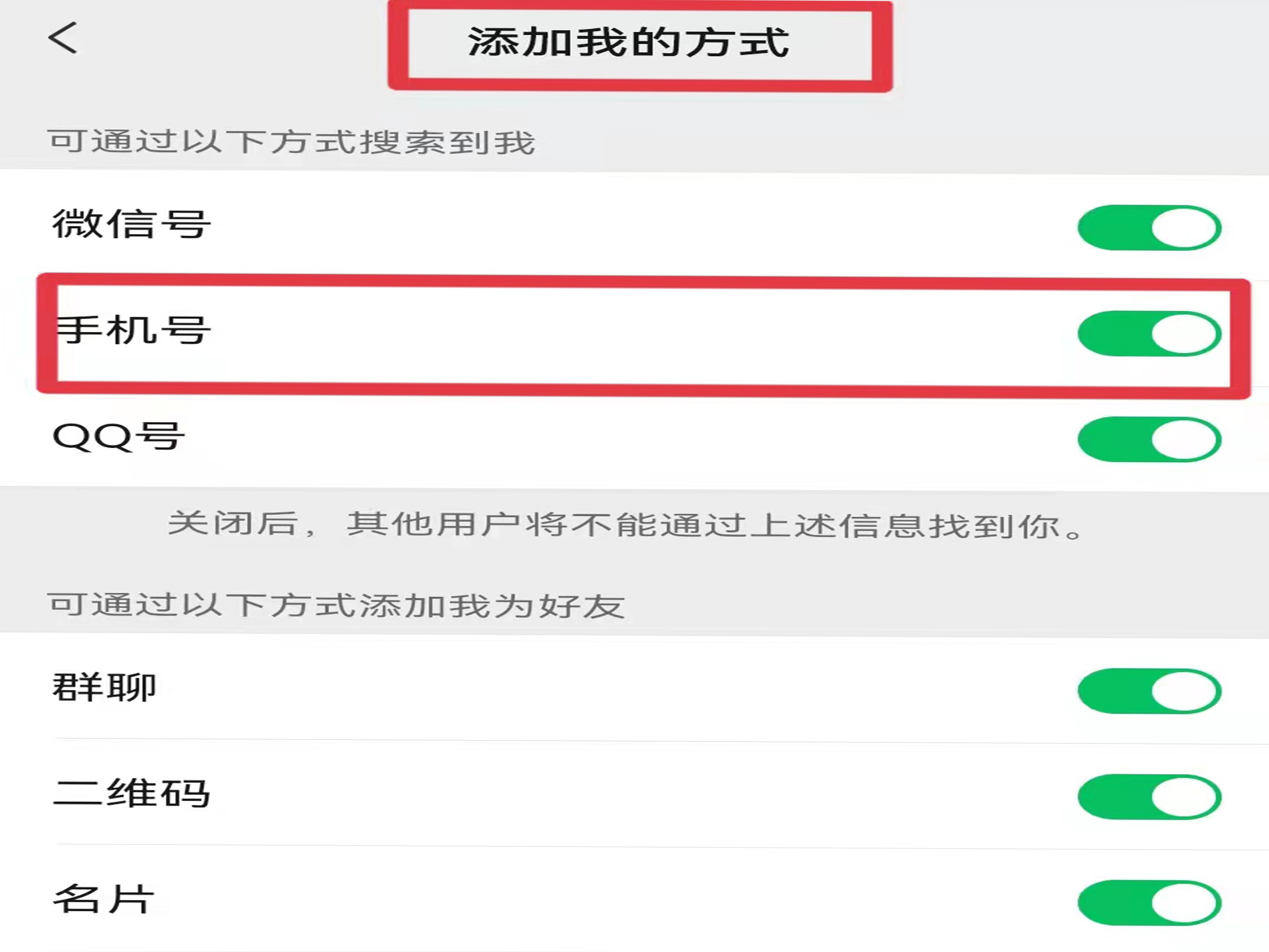 3、点击“添加我的方式”,开启“QQ号”右侧的按钮。
