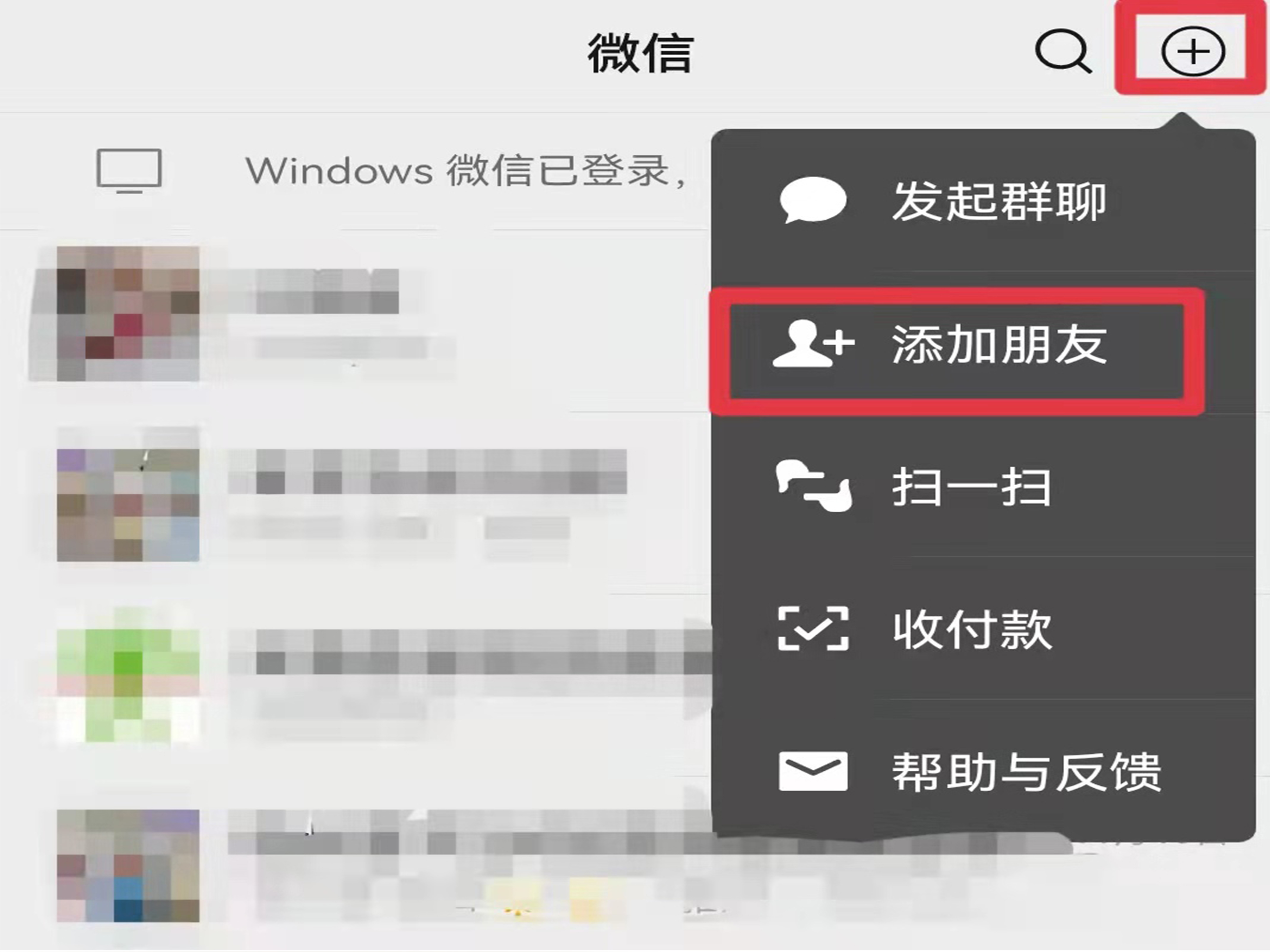 4、切换到微信主页面,点击右上角的“+”图标,点击“添加朋友”。