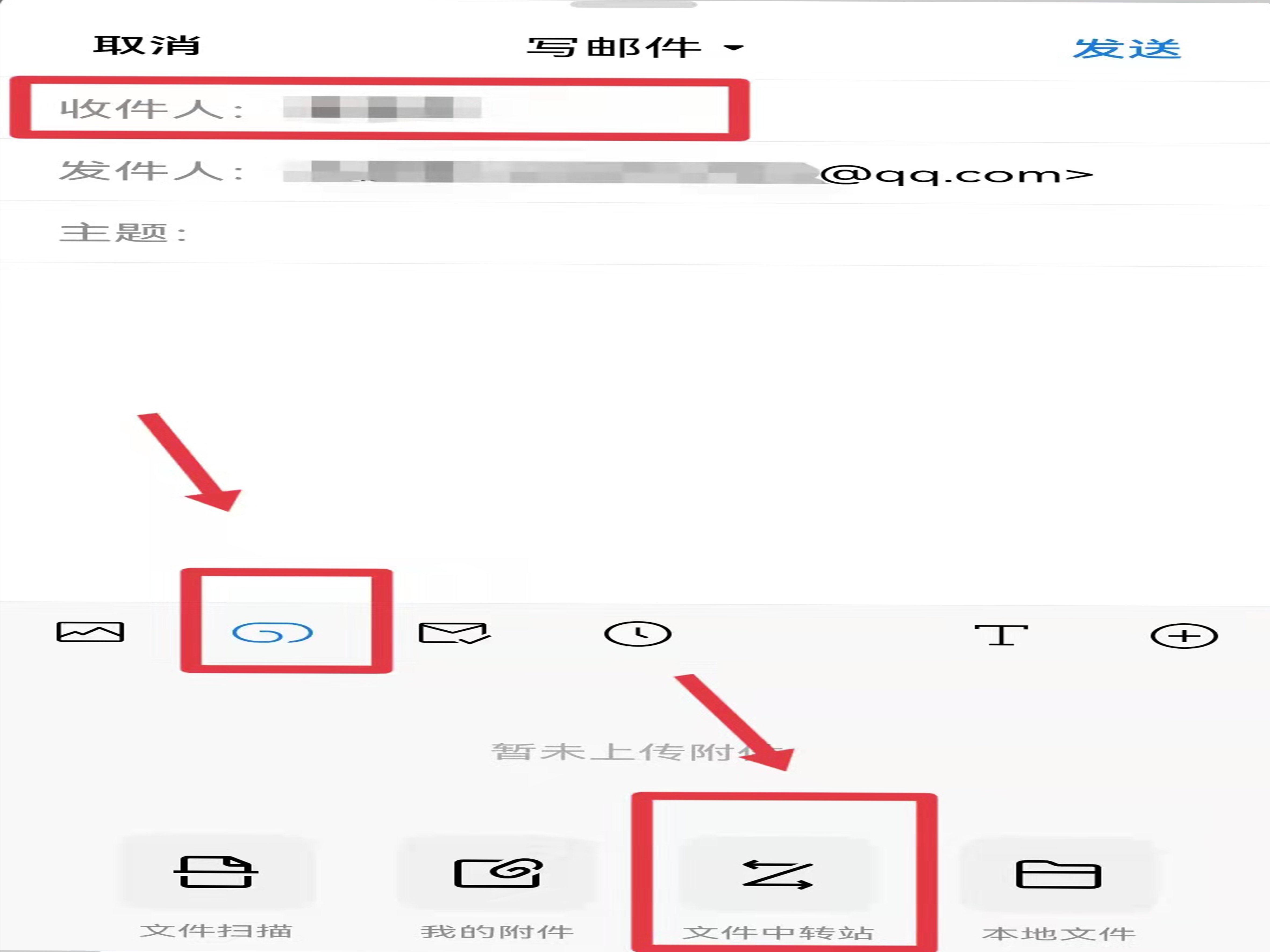 4、选择收件人,点击“附件”图标,选择“文件中转站”。