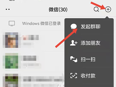1、打开微信,点击右上角+号图标,点击发起群聊。