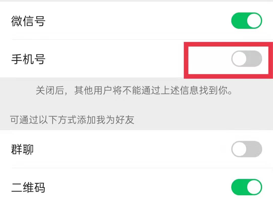 5、 在添加我的方式页面中把手机号后面的开关关闭即可隐藏手机号码。