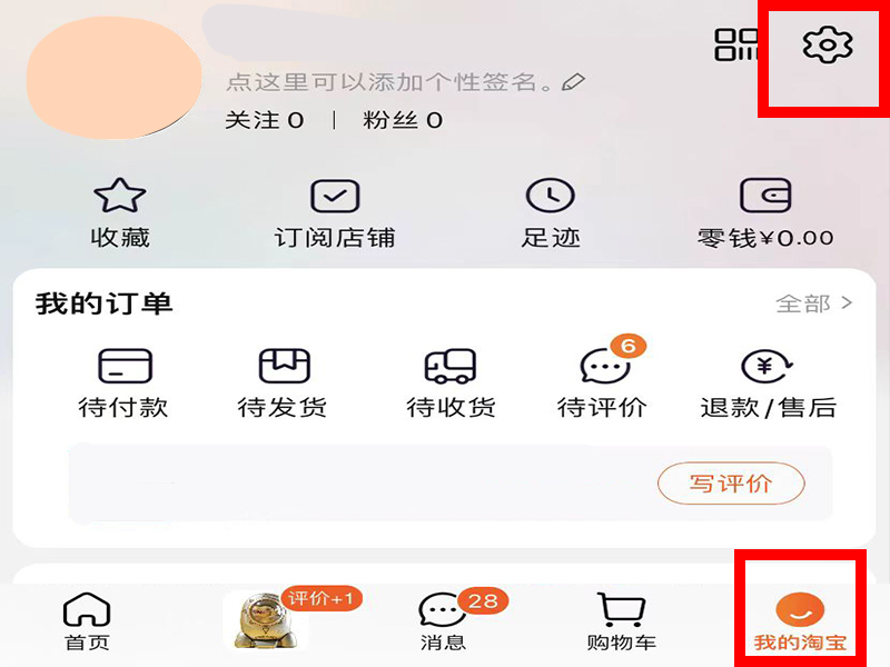 1、打开淘宝app,点击进入“我的淘宝”界面,再点击右上角的设置。