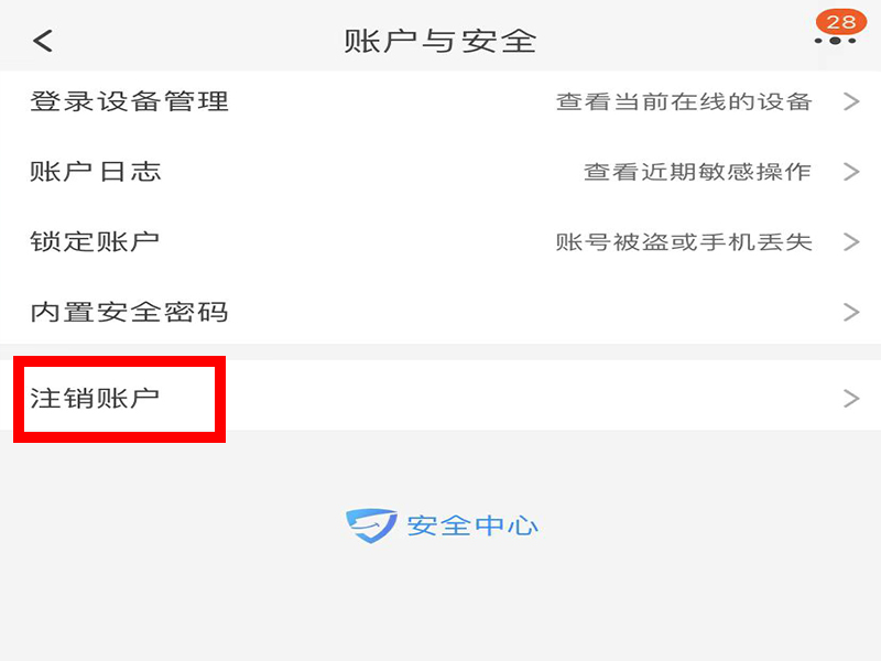 3、进入“账户与安全”界面后,点击下方的“注销账户”即可。