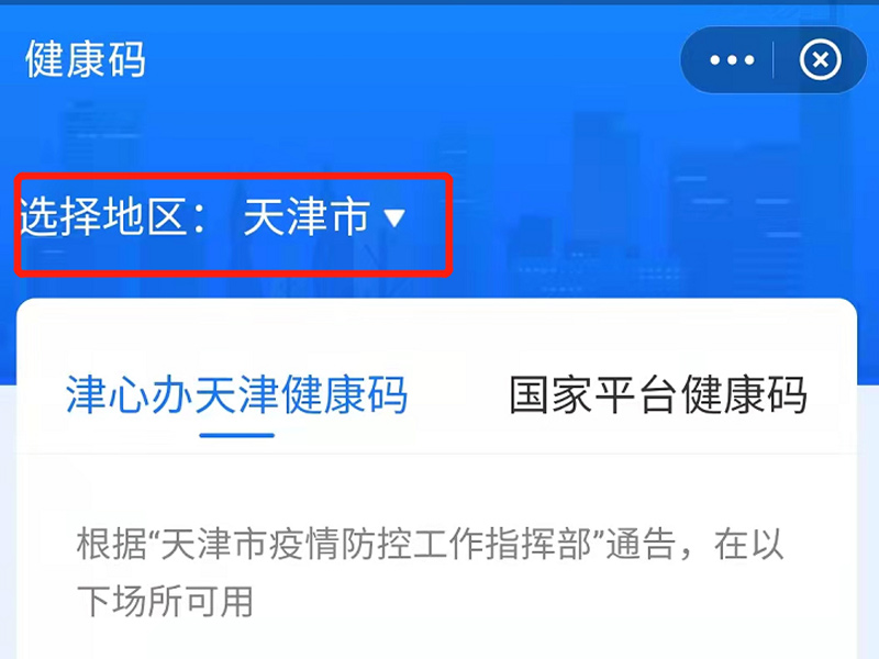 2、点击进入健康码界面后,在地区选择的地方选择天津市,再点击立即查看。