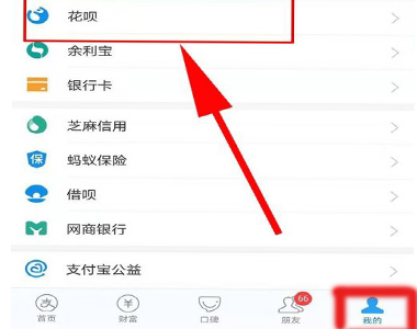 1、打开支付宝切换至“我的”页面,点击花呗。