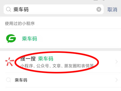 2、在搜索框内输入“乘车码”,点击“搜一搜乘车码”。