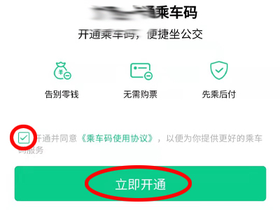 4、首次使用会根据定位推荐相应地区的公交卡,勾选“同意协议”并点击“立即开通”即可。