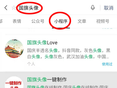 2、在搜索框内输入“国旗头像”,切换到小程序模块,选择其中一个小程序并进入,这里选择国旗头像Love。