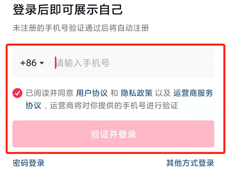 用手机号登录抖音的具体步骤如下:1、打开抖音app,点击用其他手机号码登录。2、然后输入手机号,再点击验证并登录即可。3、也可以选择使用密码登录,输入手机号和登录密码再点击登录即可。