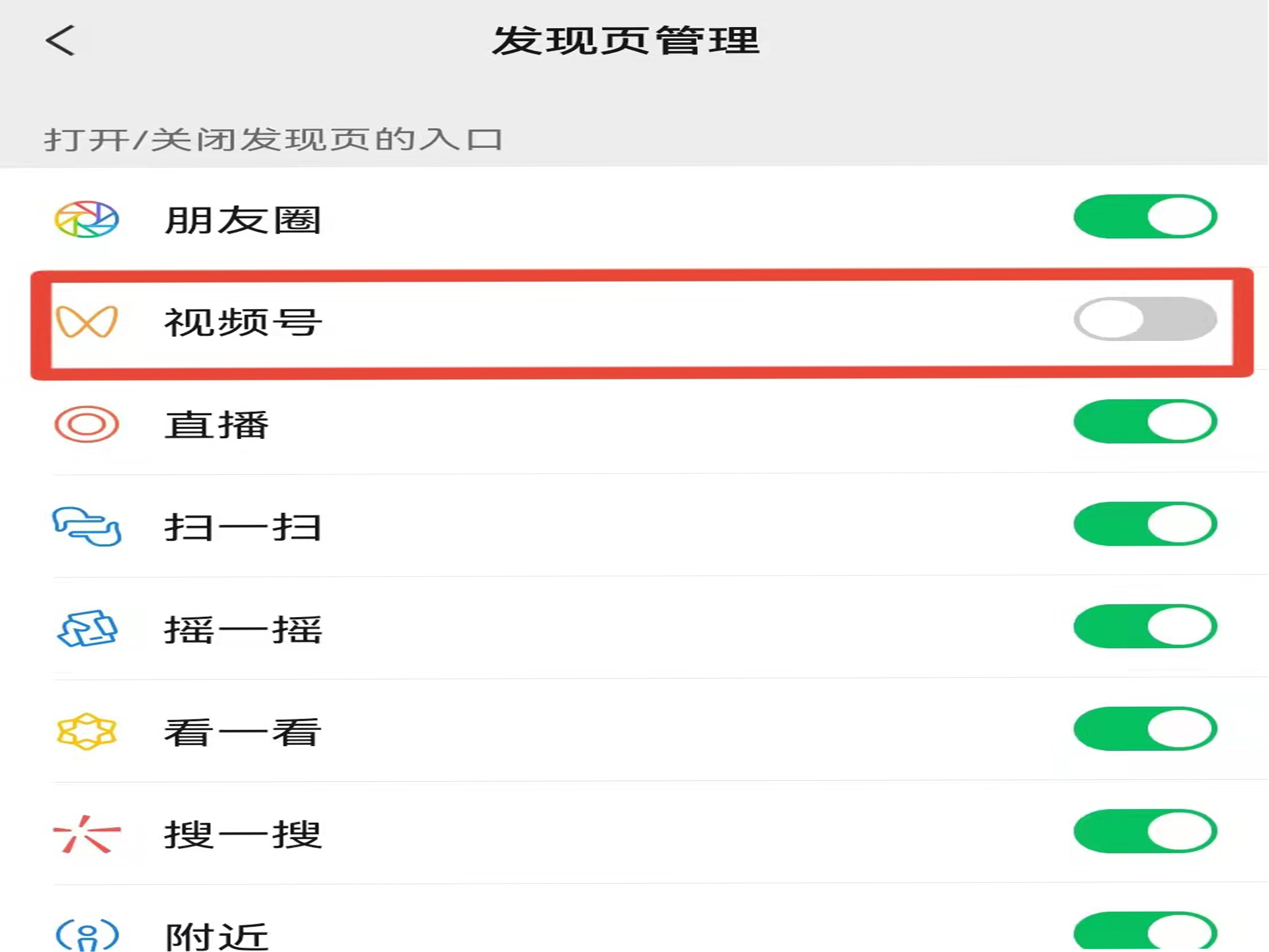3、在发现页管理页面,关闭“视频号”右侧的按钮即可。