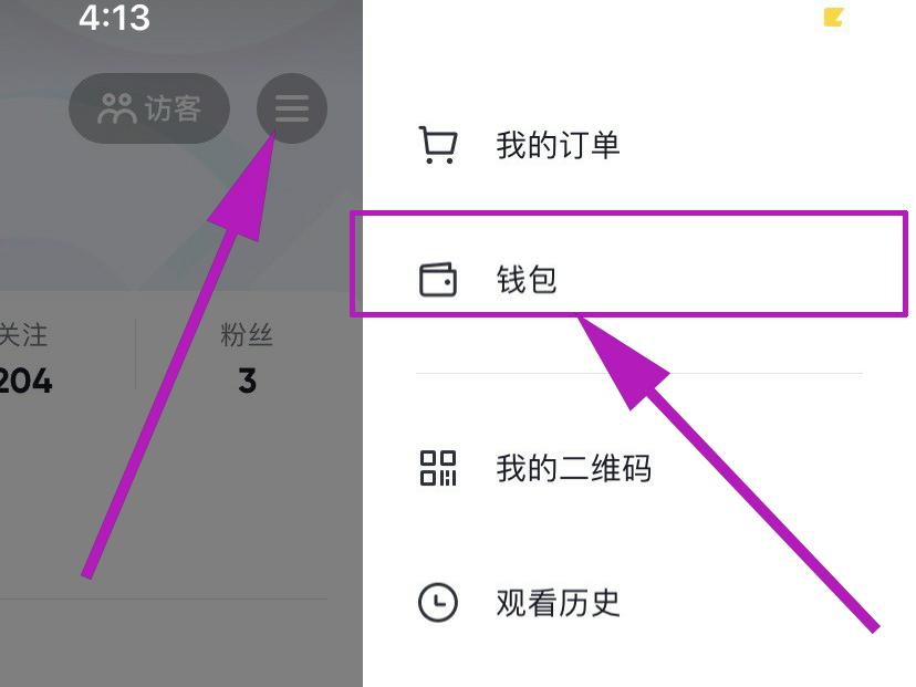 2、在我的主页中,点击右上角的三横线图标,然后在弹出的选项中,找到“钱包”选项,然后点击打开。