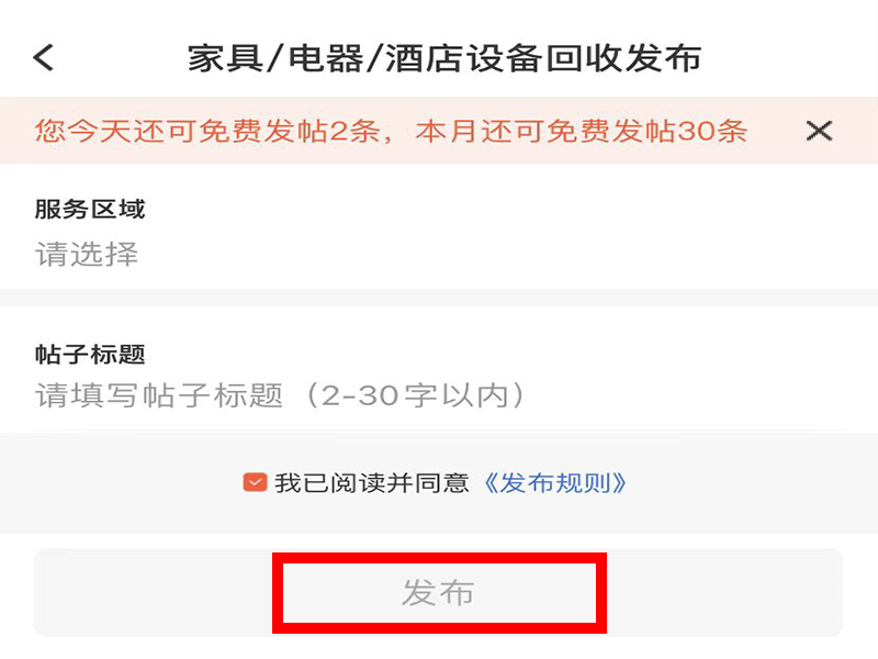 4、选择广告类别后,进入“发布”界面,将信息填写完毕后即可进行发布。