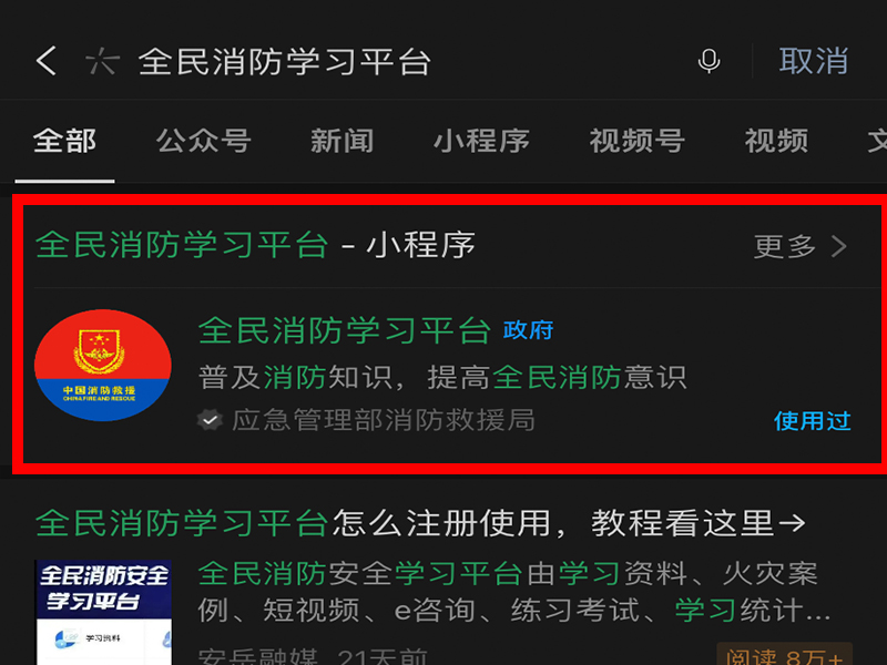 2、在弹出来的搜索结果中点击“全民消防学习平台”小程序。