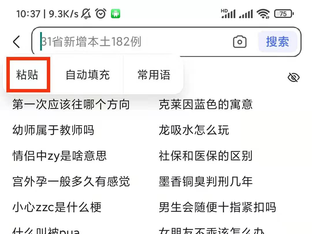 2、点击页面上方的搜索栏,长按搜索栏,在新弹出的界面点击“粘贴”将复制的视频链接粘贴上去。