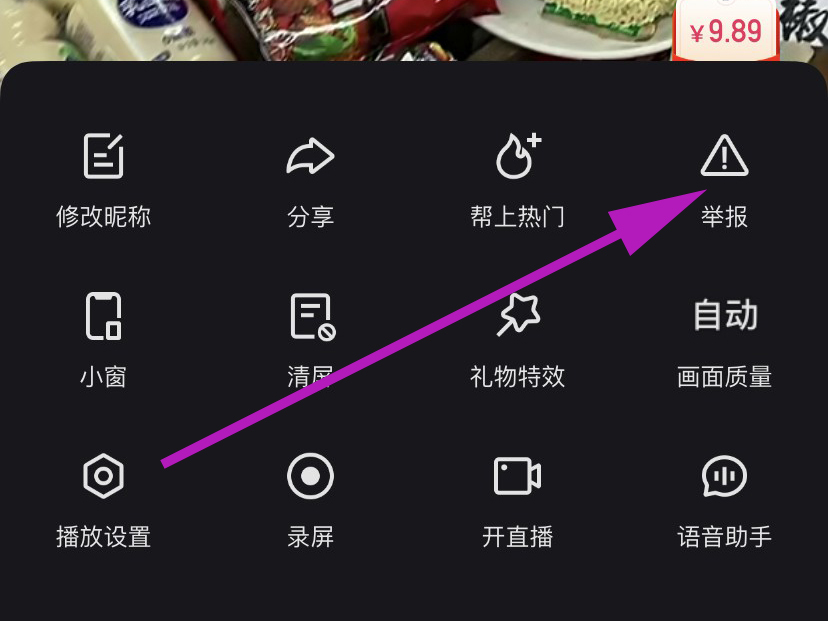 2、在打开的选择页面中找到“举报”选项,点击即可根据实际情况对带货直播间进行举报。