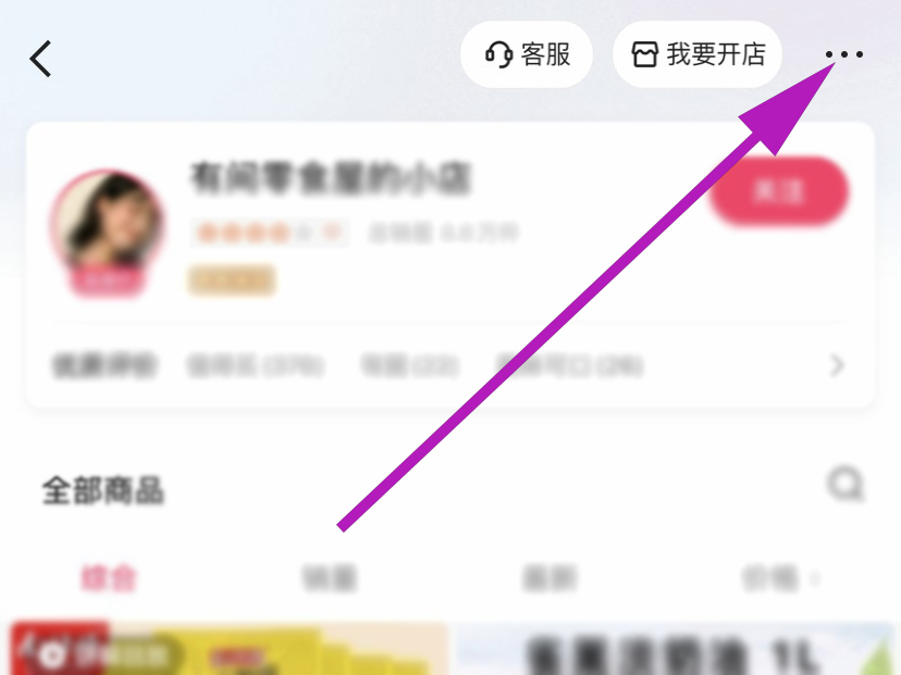 3、如果想在店铺中直接举报,则来到想要举报的店铺页面中,然后点击右上角的三个小点打开选项页面,点击举报即可对店铺进行举报。