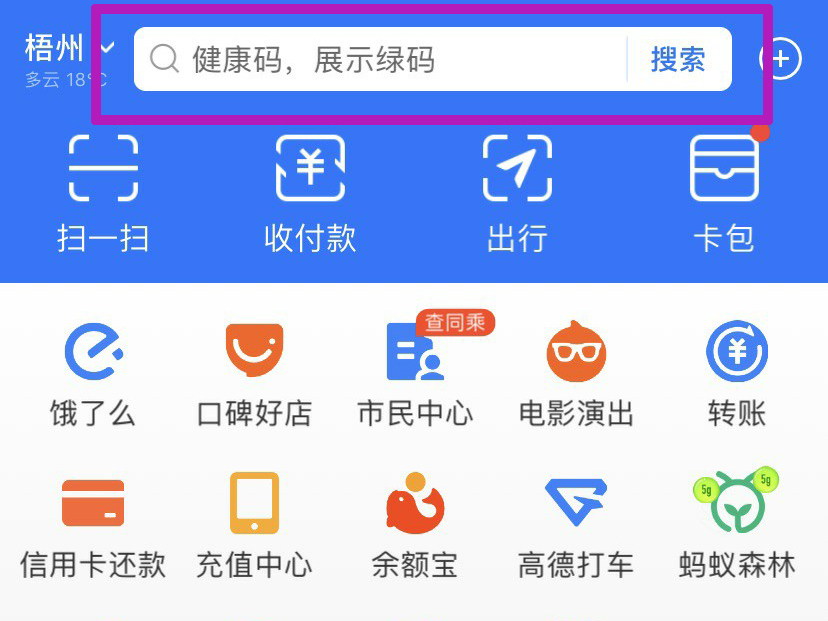 1、打开支付宝,在正上方的搜索框中搜索健康码,然后点击进入。