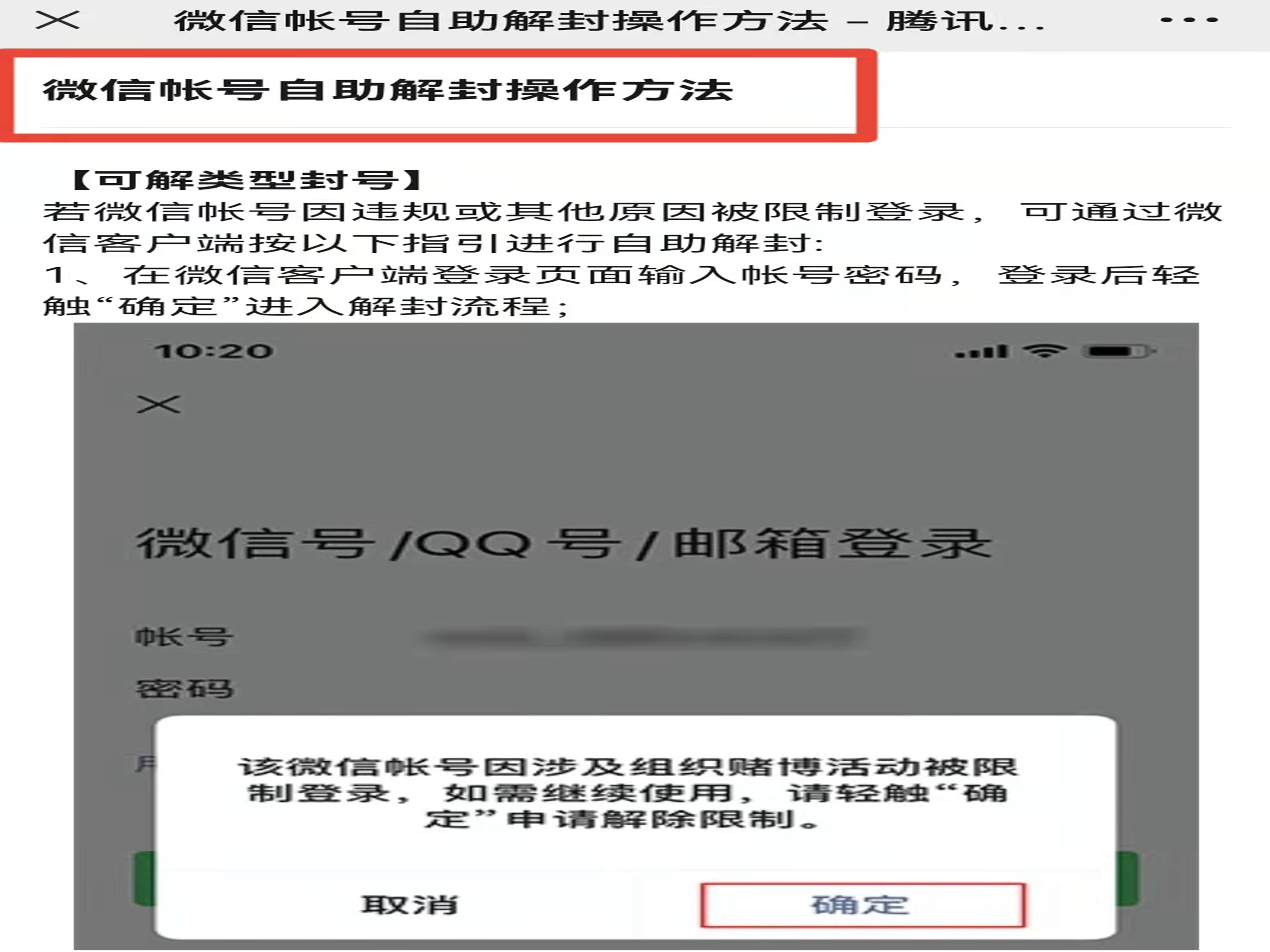 3、点击“解封账号”,切换页面后即可查看到微信账号自助解封操作方法。