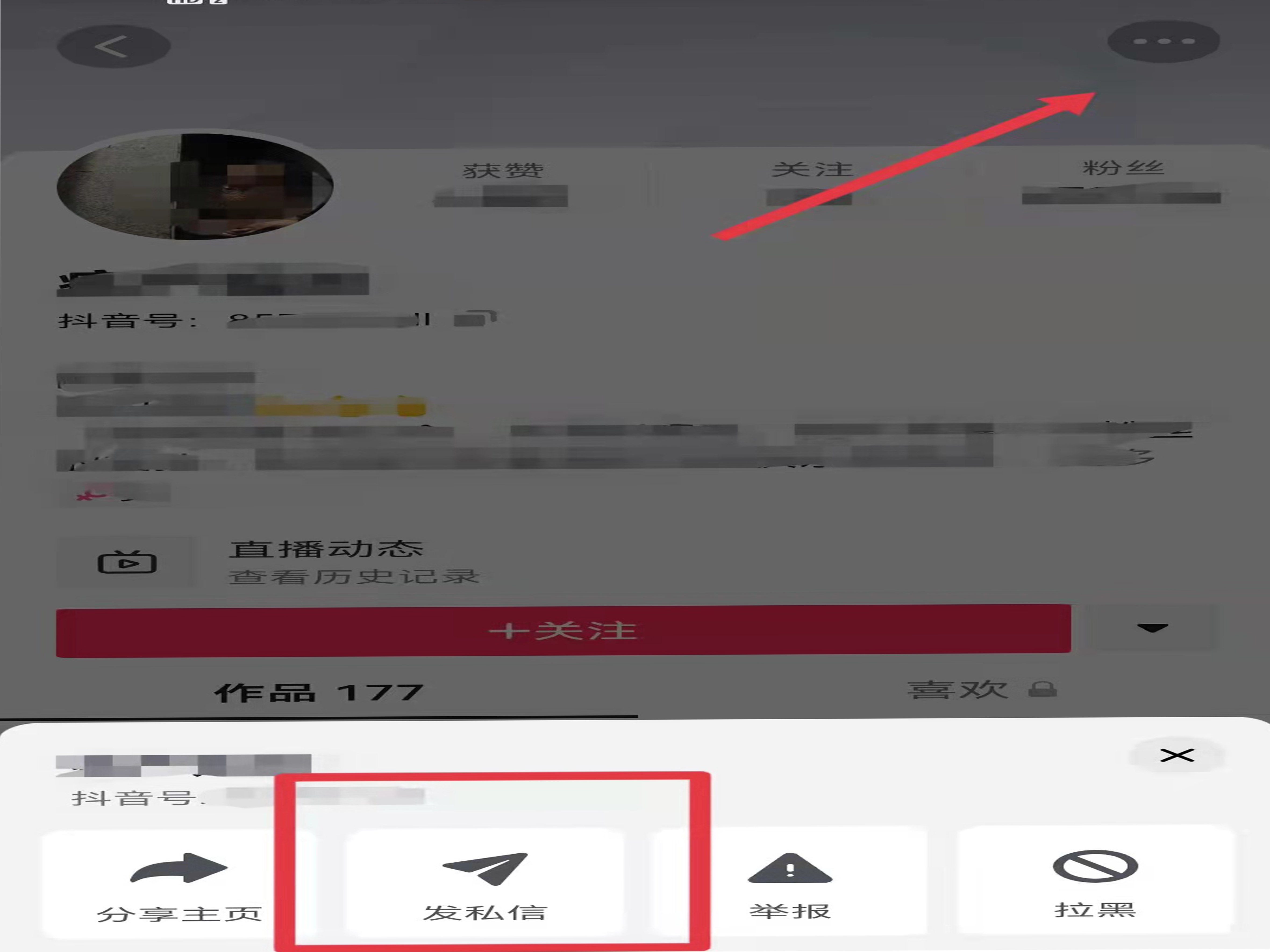 4、进入作者个人主页,点击右上角的“三个点”图标,选择“发私信”即可。