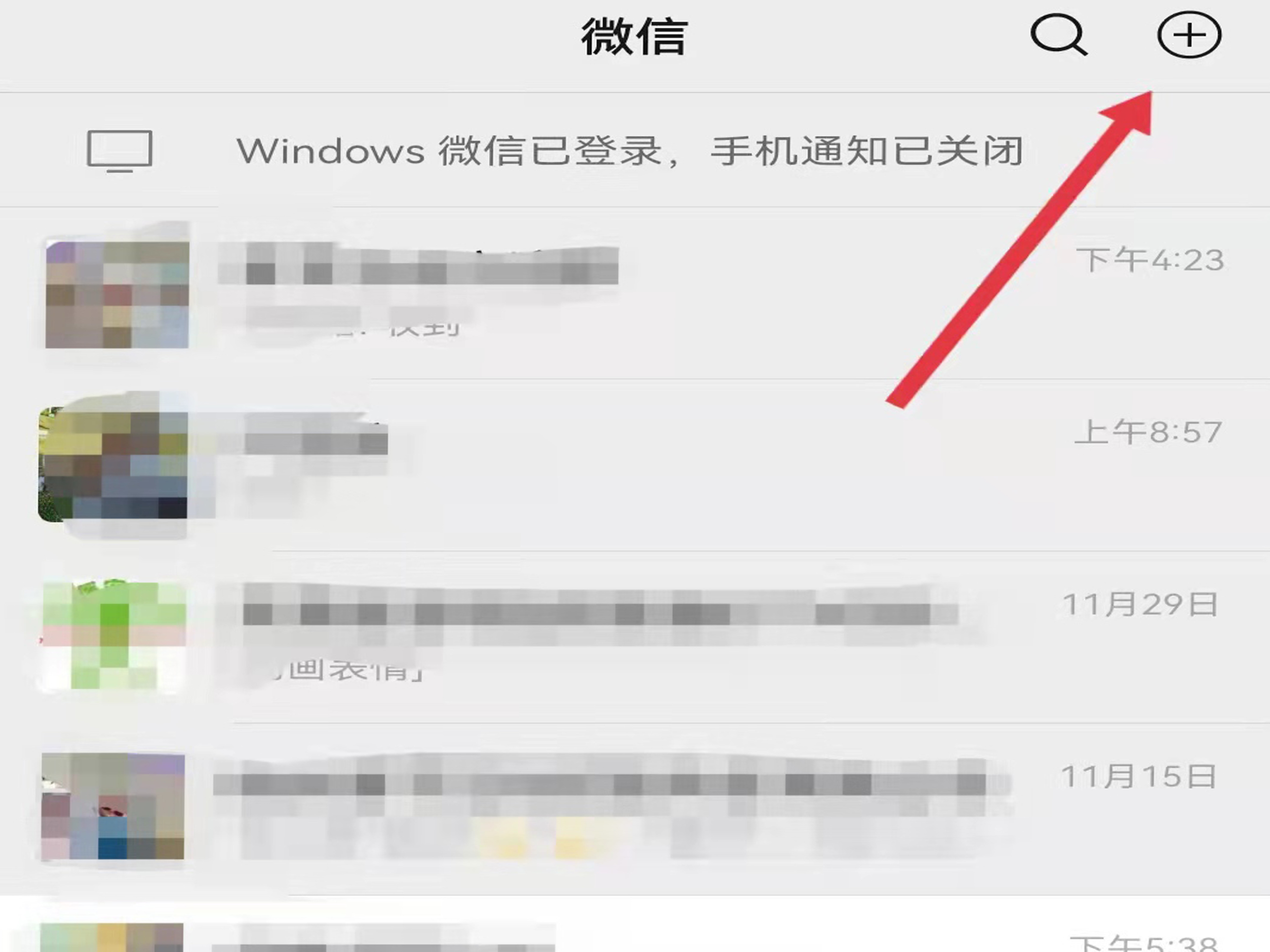 1、打开手机微信,在微信主页面点击右上角的“+”图标。