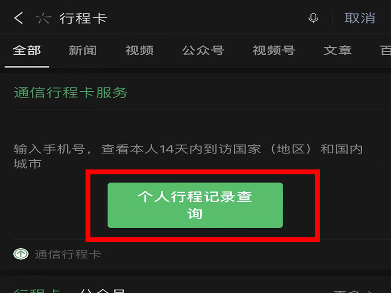 2、在弹出的搜索结果页面中,点击“个人行程记录查询”。