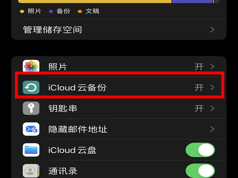 3、进入“iCloud”界面后,点击“iCloud云备份”。