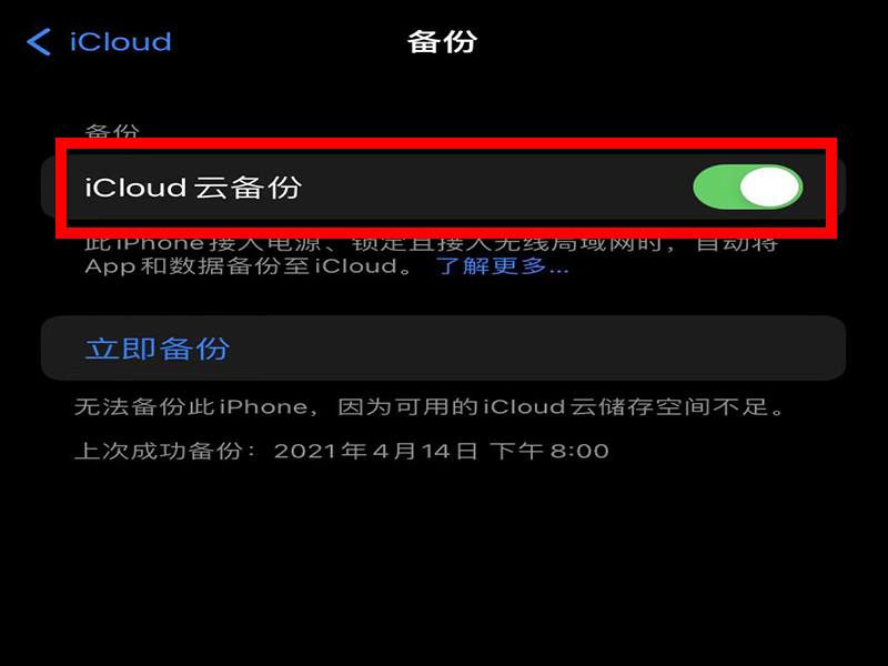 4、进入“备份”界面后,点击“iCloud云备份”右边的符号即可。