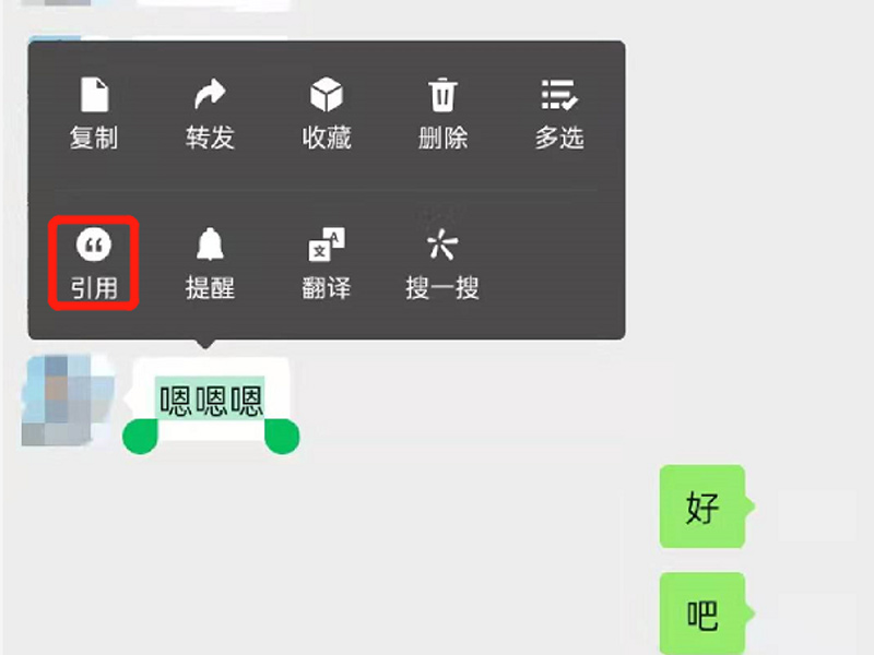2、长按需要引用的消息,在弹起的选项中选择“引用”,发送即可。